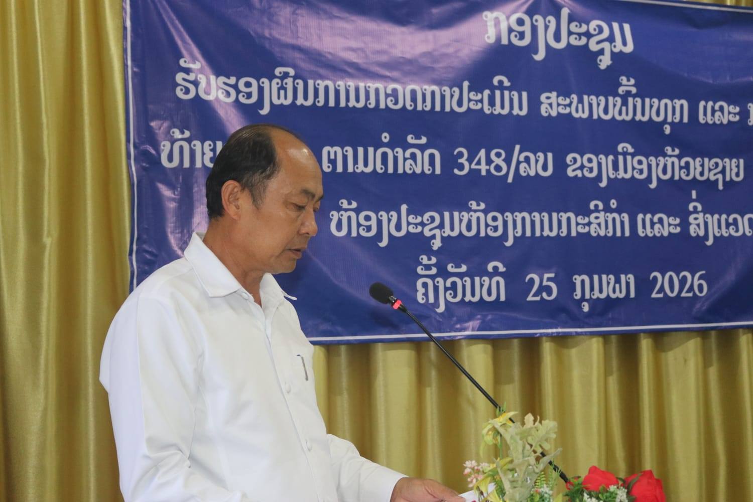 ວັນທີ 25 ກຸມພານີ້, ຫ້ອງການກະສິກໍາ ແລະ ສິ່ງແວດ ລ້ອມເມືອງຫ້ວຍຊາຍ, ຈັດກອງປະຊຸມຮັບຮອງການກວດກາປະເມີນທ້າຍສະໄໝຕາມດໍາລັດ 348/ລບ ວ່າດ້ວຍມາດຕະຖານພົ້ນທຸກ ແລະ ມາດຕະຖານພັດທະນາຂອງ ເມືອງຫ້ວຍຊາຍ ປະຈໍາປີ 2025, ໂດຍການເປັນປະທານຂອງ ທ່ານ ສຸກສະຫວັນ ແກ້ວປະເສີດ ຄະນະປະຈໍາພັກເມືອງ, ຫົວໜ້າຫ້ອງການກະສິກໍາ ແລະ ສິ່ງແວດລ້ອມເມືອງຫ້ວຍຊາຍ, ເຂົ້າຮ່ວມມີ ທ່ານ ແກ່ນຈັນ ທໍາມະແສງ ກໍາມະການພັກແຂວງ ຫົວໜ້າພະແນກກະສິກໍາ ແລະ ສິ່ງແວດລ້ອມແຂວງ ທ່ານ ຄໍາຜາຍ ວົງປະເສີດ ຄະນະປະຈໍາພັກເມືອງ, ຮອງປະທານຄະນະກໍາມະການປົກຄອງເມືອງຫ້ວຍຊາຍ, ມີບັນດາຄະນະຮັບຜິດຊອບ ແລະ ຫ້ອງການທີ່ກ່ຽວຂ້ອງເຂົ້າຮ່ວມ.