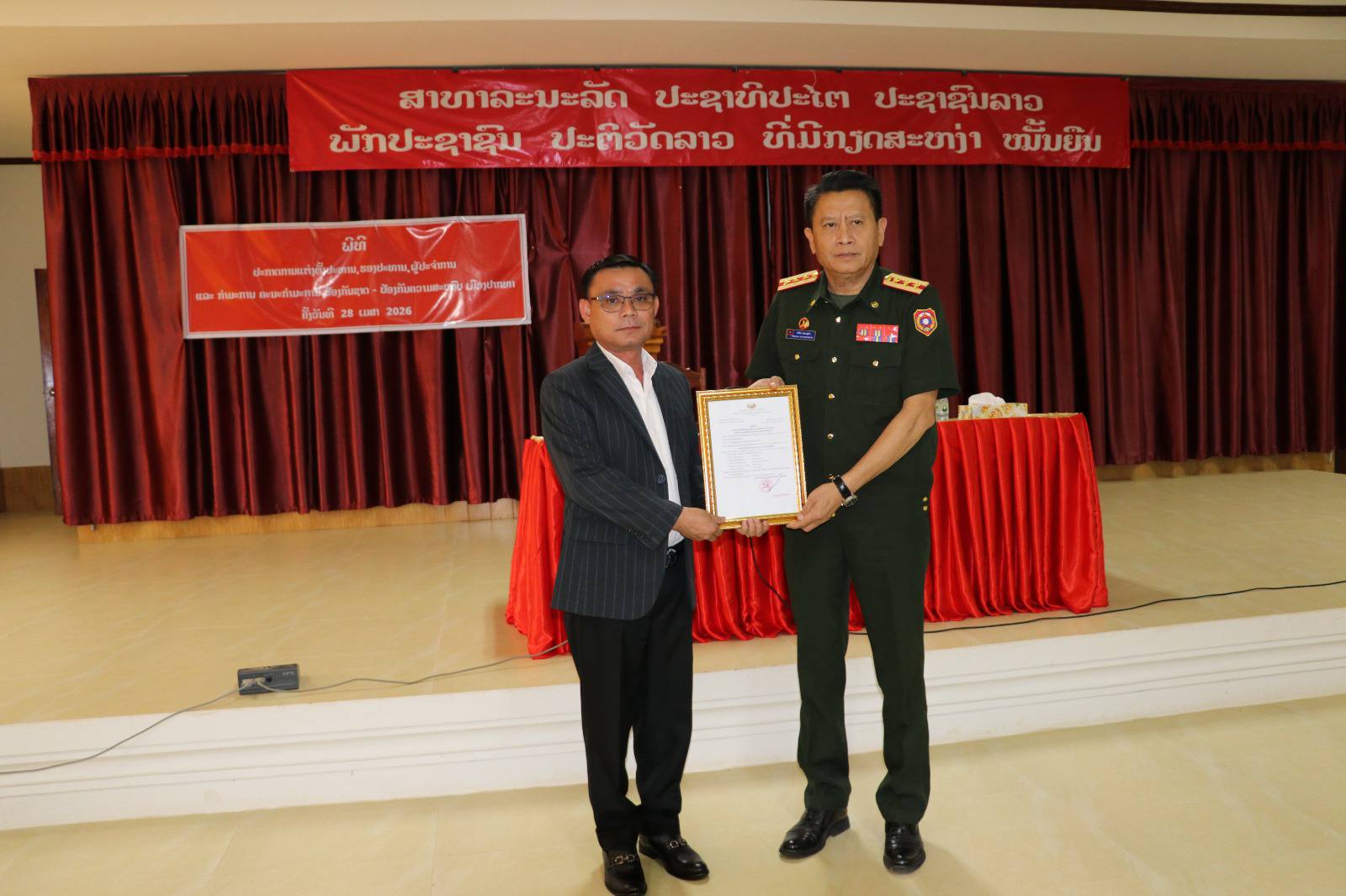 ວັນທີ 28 ເມສາ 2026ນີ້ ຢູ່ທີ່ກອງບັນຊາການປ້ອງກັນຄວາມສະຫງົບເມືອງ ໂດຍມີ ສະຫາຍ ສາລີ ວັນນະສານ ກຳມະການພັກແຂວງ ເລຂາຄະນະບໍລິຫານງານພັກເມືອງປາກທາ, ສະຫາຍ ພັອ ອຳພັນ ໄຊຍາສຸບັດ ຄະນະກຳມະ ການ ປ້ອງກັນຊາດ-ປ້ອງກັນຄວາມສະຫົງບແຂວງ, ຫົວ ໜ້າການເມືອງກອງບັນຊາການທະຫານ ແຂວງບໍ່ແກ້ວ, ມີຄະນະປະຈໍາພັກເມືອງ, ກໍາມະການພັກເມືອງ, ຄະນະກໍາມະການ ປກຊ-ປກສ ເມືອງ ແລະພາກສ່ວນທີ່ກ່ຽວຂ້ອງເຂົ້າຮ່ວມພິທີປະກາດແຕ່ງຕັ້ງ ປະທານ, ຮອງປະທານ, ຜູ້ປະຈຳການ ແລະ ກຳມະການ, ຄະນະກຳມະການປ້ອງກັນຊາດ-ປ້ອງກັນຄວາມສະຫງົບ