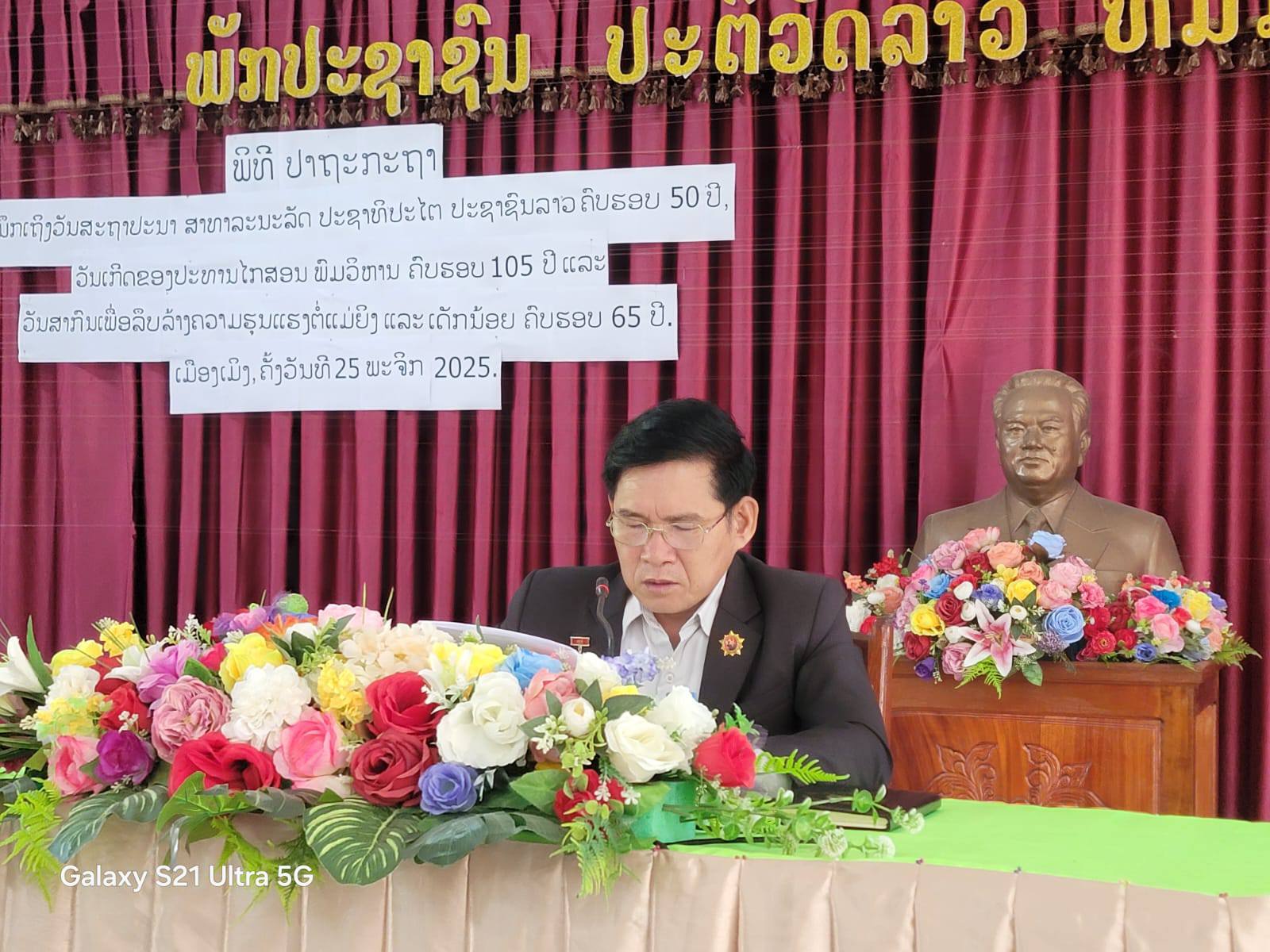 ເມືອງເມິງ, ແຂວງບໍ່ແກ້ວ ຈັດພິທີປາຖະກະຖາ ວັນສະຖາປະນາ ສປປ ລາວ ຄົບຮອບ 50 ປີ, ວັນເກີດປະທານ ໄກສອນ ພົມວິຫານ ຄົບຮອບ 105 ປີ ແລະລະນຶກວັນສາກົນເພື່ອລຶບລ້າງຄວາມຮຸນແຮງຕໍ່ແມ່ຍິງ ແລະເດັກນ້ອຍ ຄົບຮອບ 65 ປີ ໃນວັນທີ 25 ພະຈິກ 2025 ນີ້ ທີສະໂມ ສອນຂອງເມືອງ ໂດຍການເປັນປະທານ ຂອງທ່ານ ວັນນາ ຄໍາສີປະເສີດ ຮອງເລຂາພັກເມືອງ, ປະທານຄະນະກໍາມະການປົກຄອງເມືອງ ມີບັນດາທ່ານ ຄະນະບໍລິຫານງານພັກເມືອງ, ຫົວໜ້າ-ຮອງຫົວໜ້າຫ້ອງການ, ທະຫານ – ຕໍາຫຼວດ ແລະພາກສ່ວນທີ່ກ່ຽວຂ້ອງເຂົ້າຮ່ວມ